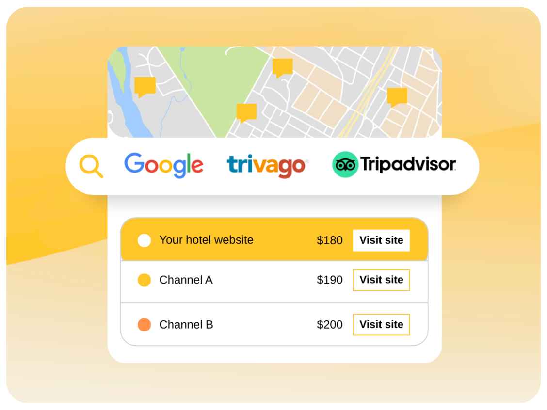 Link your booking engine to Google Hotel Ads, Kayak, Skyscanner, Tripadvisor, Trivago, and Wego. Display direct rates and availability to capture travelers searching for the best deals. Campaigns can be managed on CPC or CPA basis depending on platform and strategy.